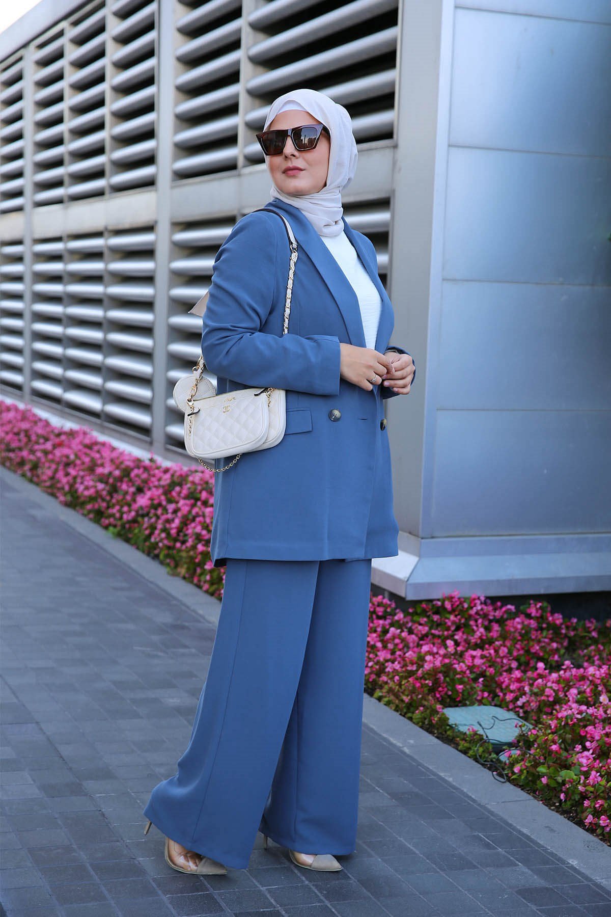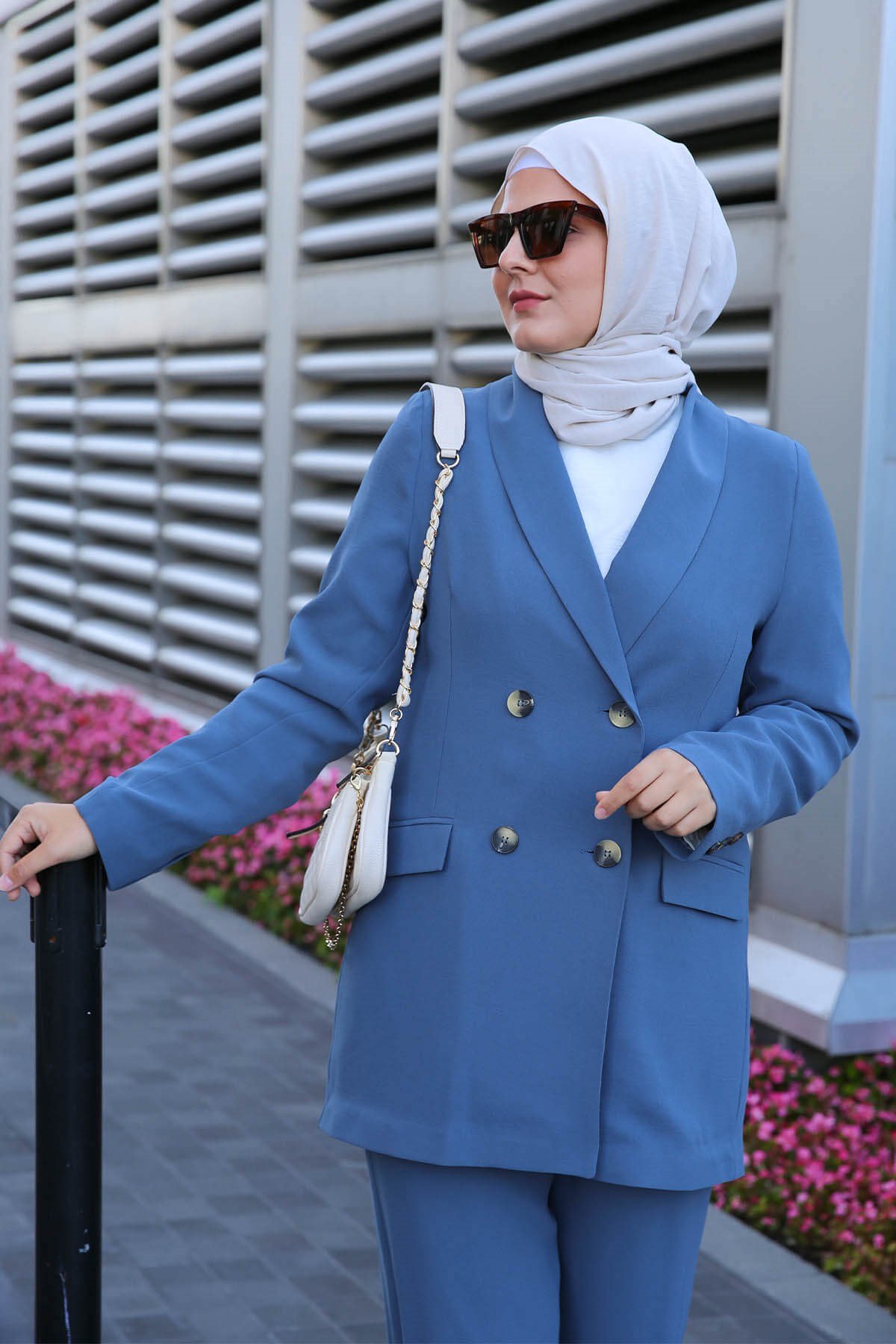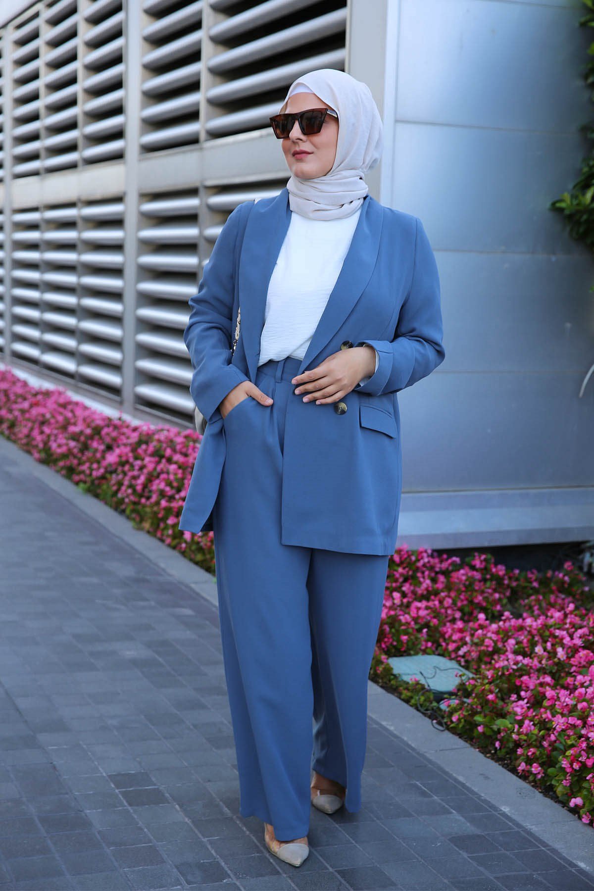 - Tailleur chic et décontracté à la fois, très agréable à porter. La taille du pantalon élastique seulement à l'arrière pour un meilleur confort. Le pantalon se ferme avec une fermeture et un bouton.