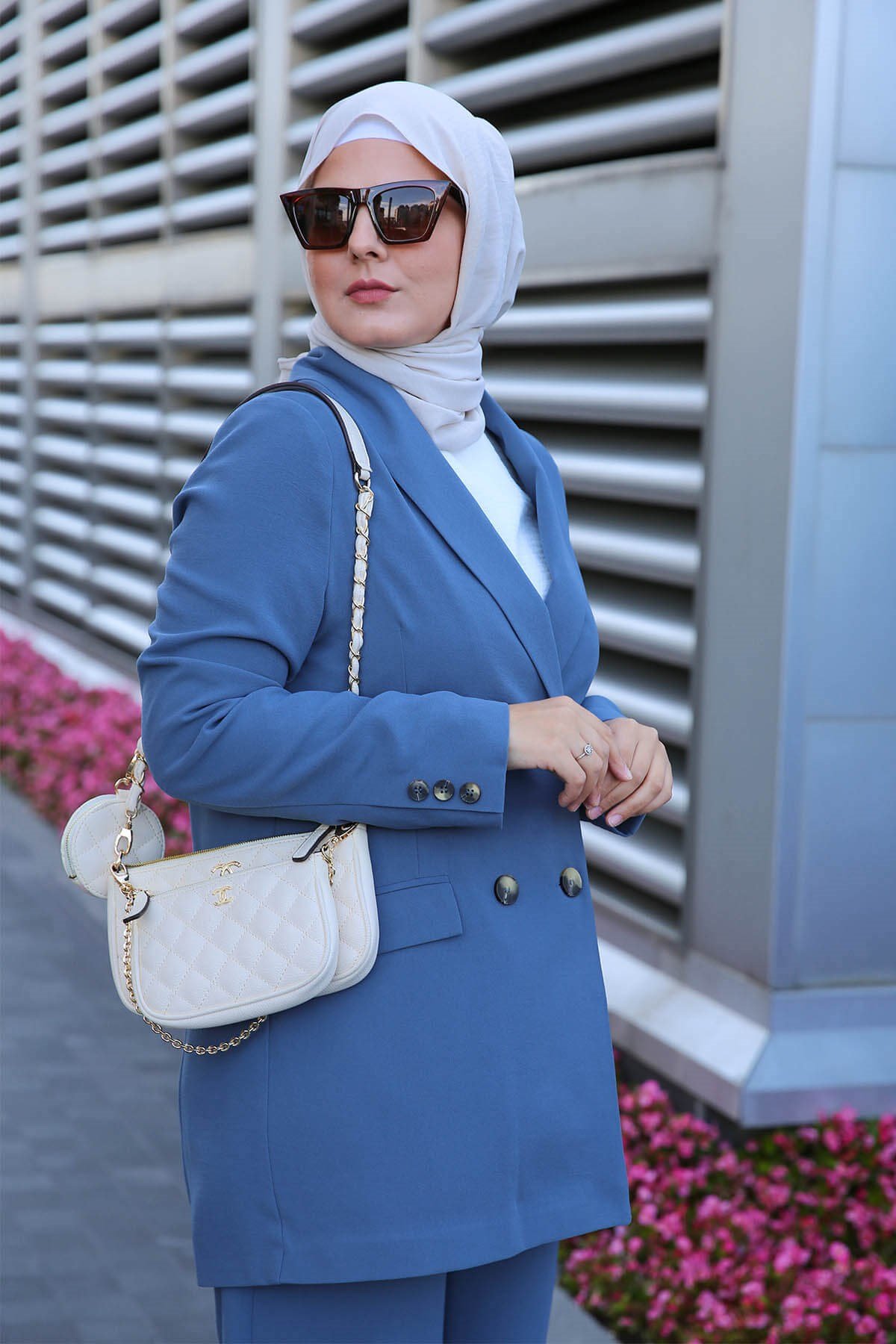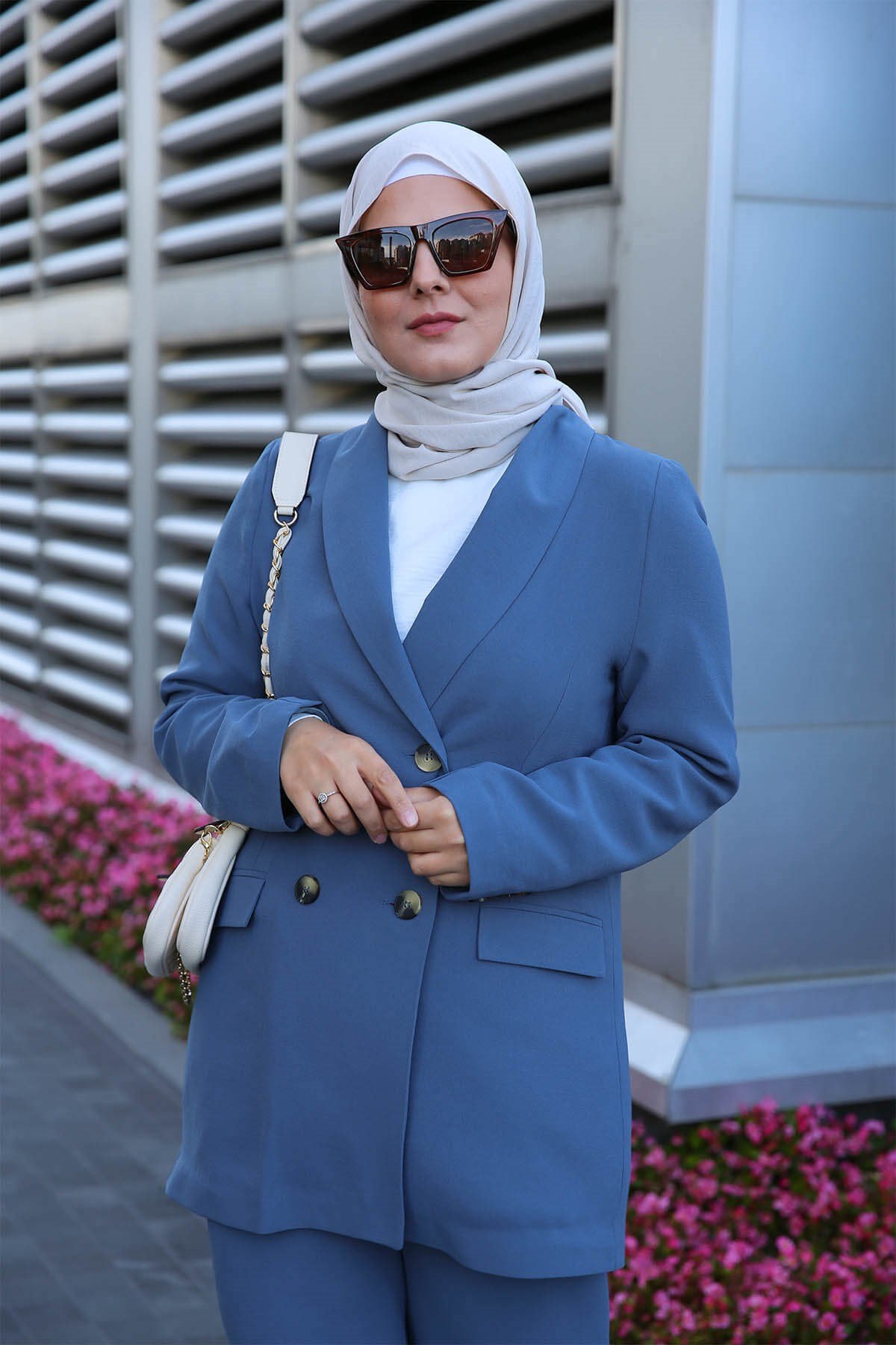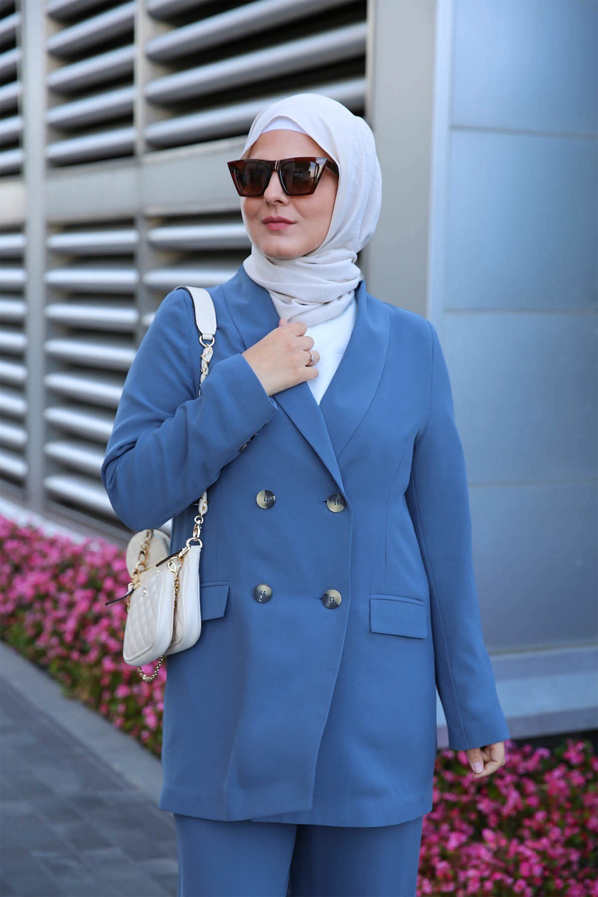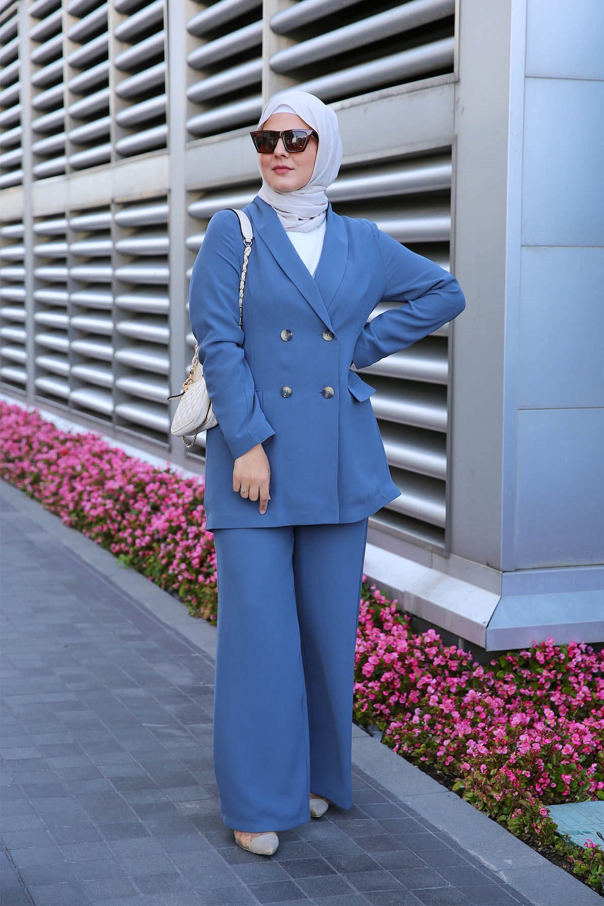 - Tailleur chic et décontracté à la fois, très agréable à porter. La taille du pantalon élastique seulement à l'arrière pour un meilleur confort. Le pantalon se ferme avec une fermeture et un bouton.