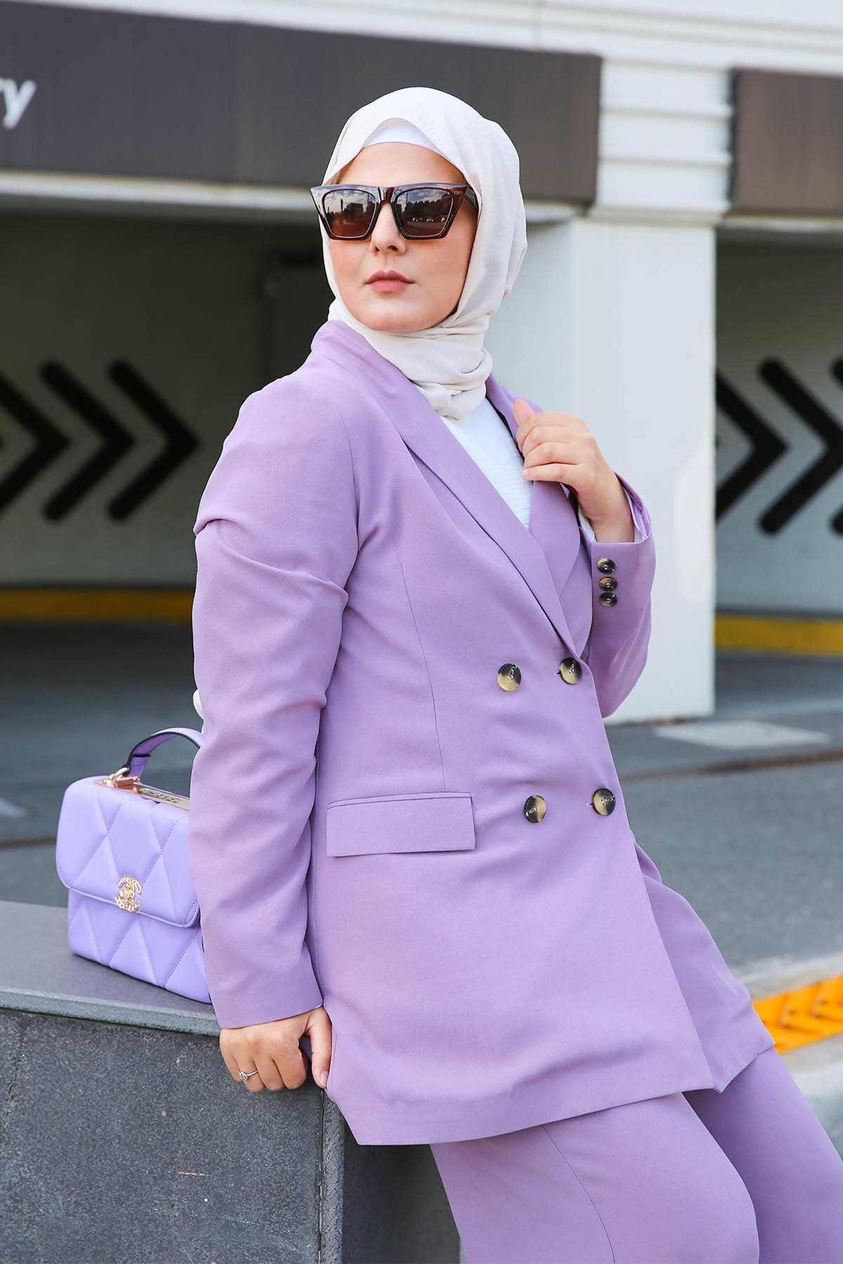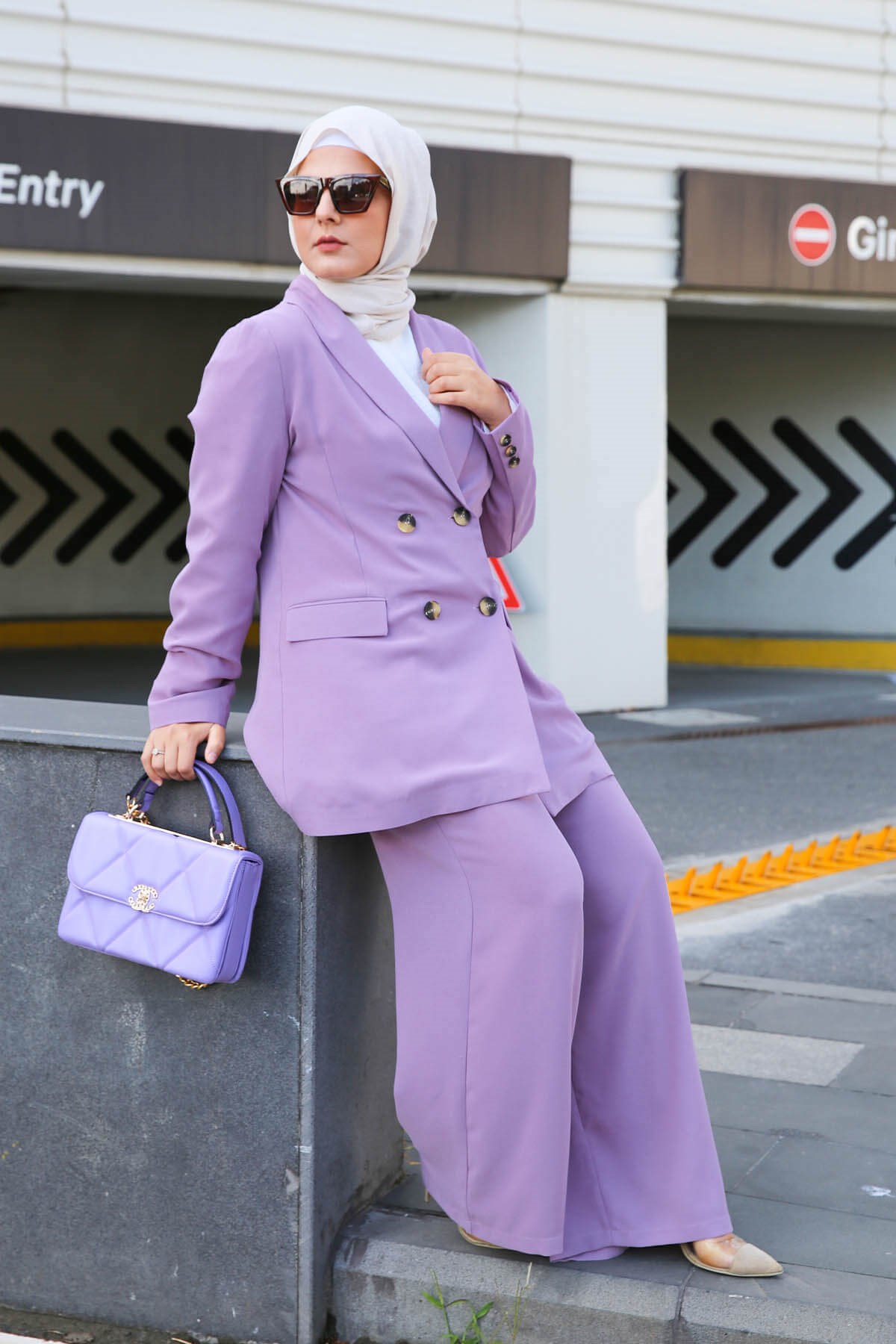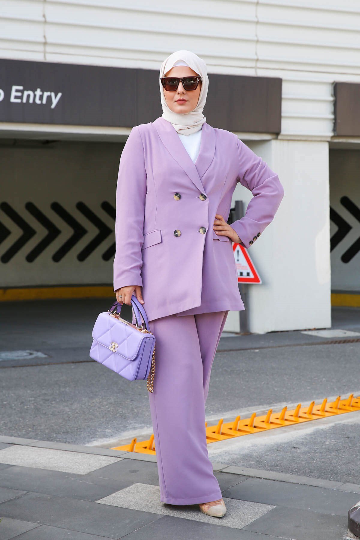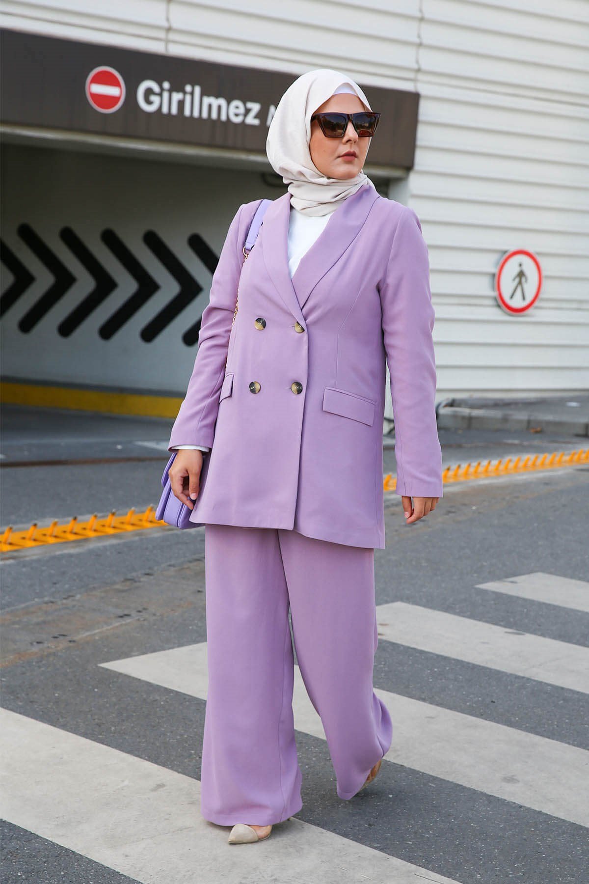 - Tailleur chic et décontracté à la fois, très agréable à porter. La taille du pantalon élastique seulement à l'arrière pour un meilleur confort. Le pantalon se ferme avec une fermeture et un bouton.